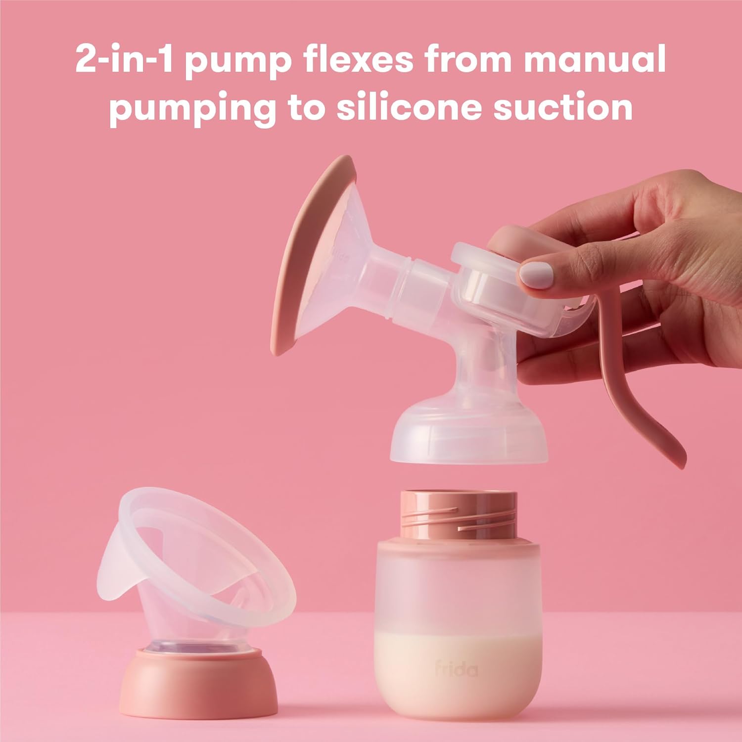 Frida Mom 2-in-1 Manual Breast Pump with Hands-Free Silicone Suction Cup, Milk Collector, Wireless Ergonomic Handle, and SoftFeel Flange for Breastfeeding